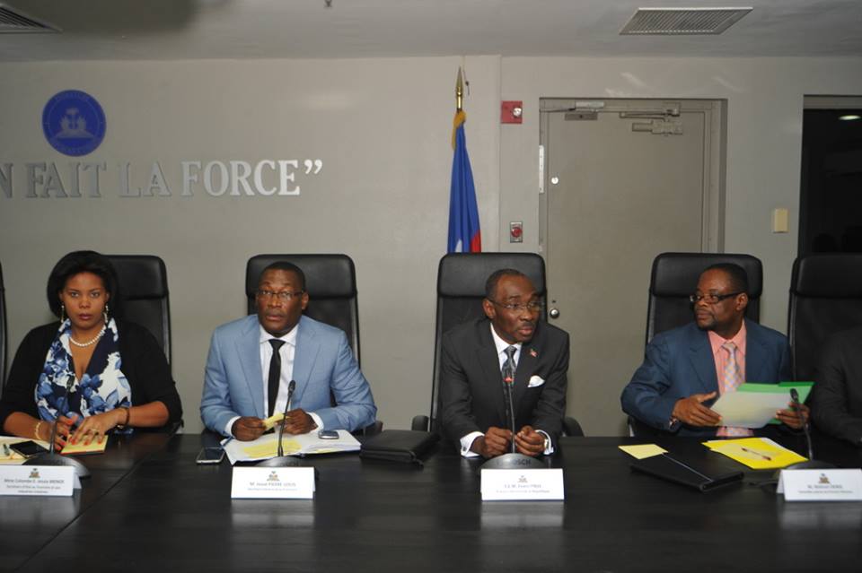 Port-au-Prince, le jeudi 30 avril 2015.- Le président de la République S.E.M Michel Joseph Martelly et le Premier ministre M. Evans Paul, accompagnés des membres du comité d’organisation du Carifesta, se sont entretenus, le mercredi 29 avril 2015, au Palais national, avec le Secrétaire général de la Caricom Monsieur Irwin LaRocque.