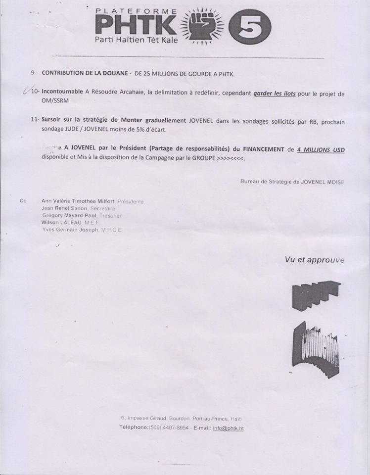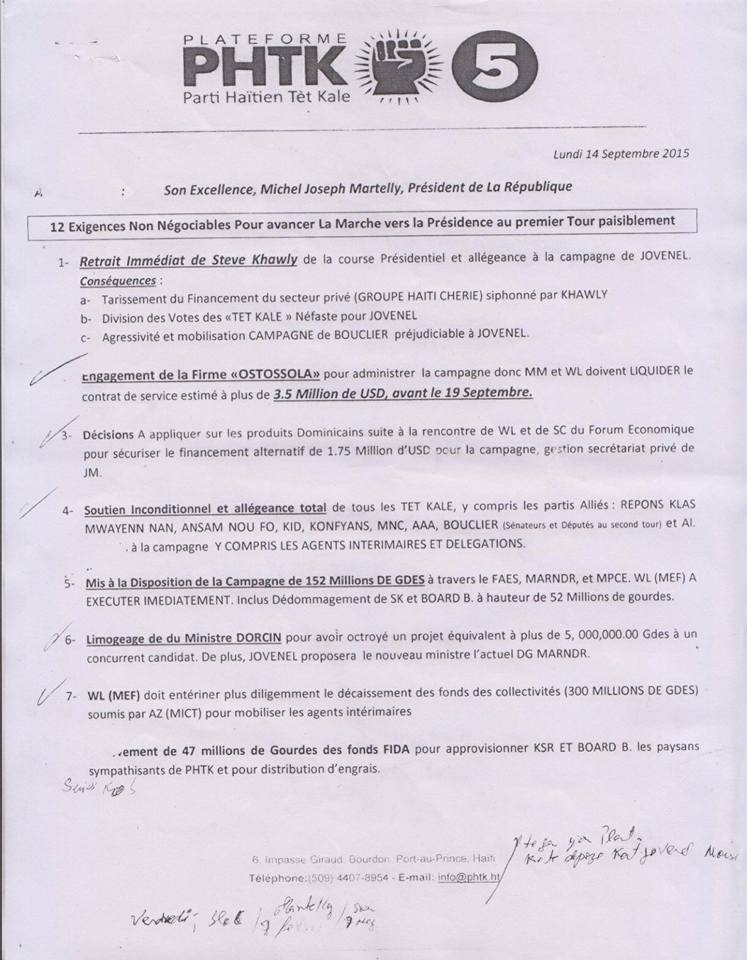 D`après ce document, dont des copies conformes ont été envoyées à plusieurs ministres et des haut placés de l`administration Martelly, l`équipe de Jovenel Moise exige non seulement un financement a partir des fonds publics, mais aussi le retrait du candidat a la présidence de Bouclier, Steeve Khawly et le limogeage du ministre de l`agriculture, Fresner Dorcin, qui, semble-t-il, serait trop proche de ce parti.
