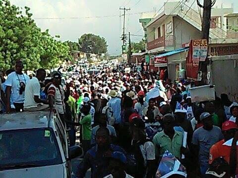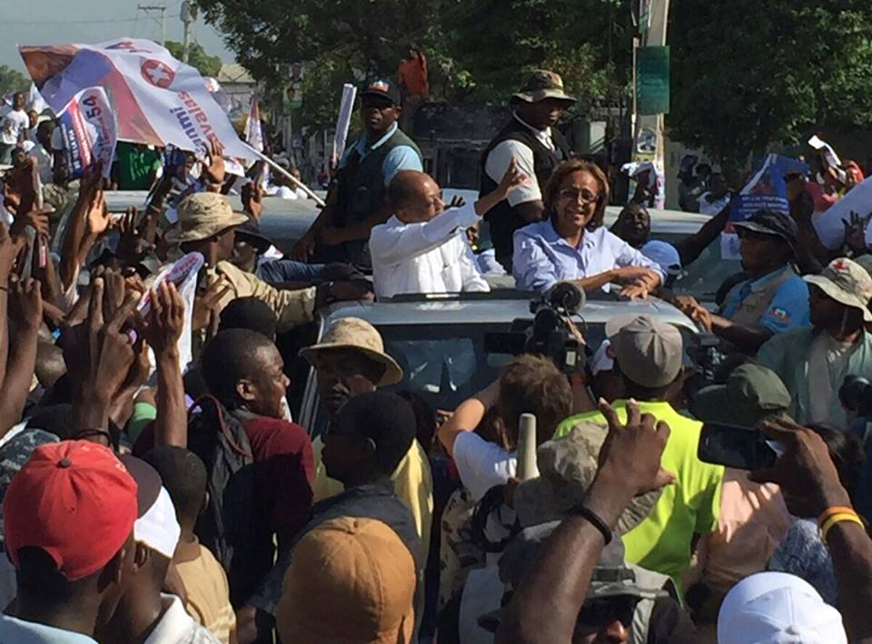 L`ancien prêtre de Saint-Jean Bosco a parcouru les rues, debout, et apparaissant à travers le toit d`une voiture, avec à ses côtés, Maryse Narcisse, la candidate à la présidence de son parti.