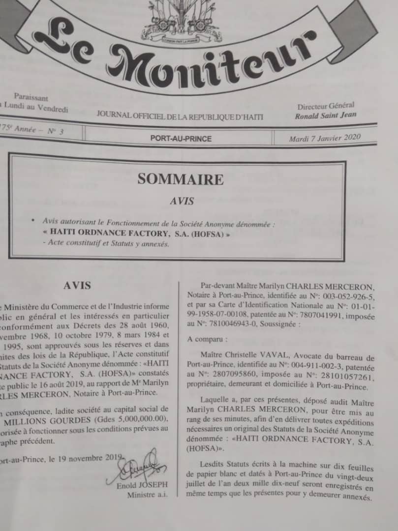 Pour parvenir à ses fins politiques, Jovenel Moise a permis les 7 janvier et 21 avril 2020 respectivement, la publication dans le Moniteur de deux avis portant création et organisation de Haïti Ordnance Factory SA [HOFSA] et de Tradex Haïti SA. Deux compagnies avec les mêmes noms des actionnaires se sont vus confiés par le Palais National la mission traitant de « toutes opérations commerciales se rapportant à l’acquisition, à la distribution, la vente et revente de produits, de matériels, équipements de sécurité de toutes sortes« .