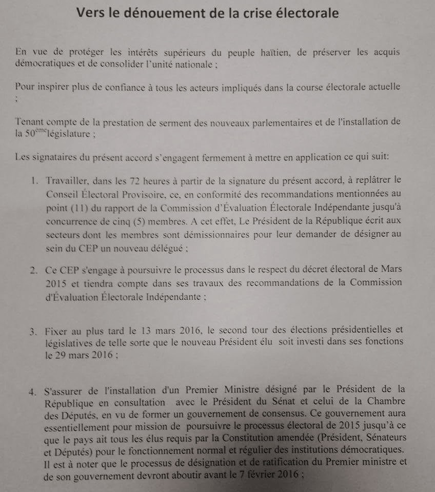 Entre temps, le palais national a fait circuler une proposition de sortie de crise, selon laquelle le président Michel Martelly pourrait rester au pouvoir après l`expiration de son mandat, le 7 février 2016.