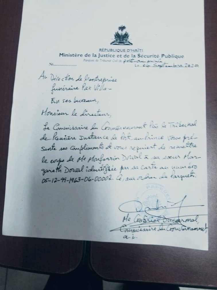 Dimanche 6 septembre 2020 ((rezonodwes.com))–Une note manuscrite adressée par le Commissaire du Gouvernement de Port-au-Prince à l’entrepreneur des pompes funèbres Pax Villa, a autorisé celui-ci à « remettre le corps de Me. Monferrier Dorval à sa sœur Margareth Dorval« .