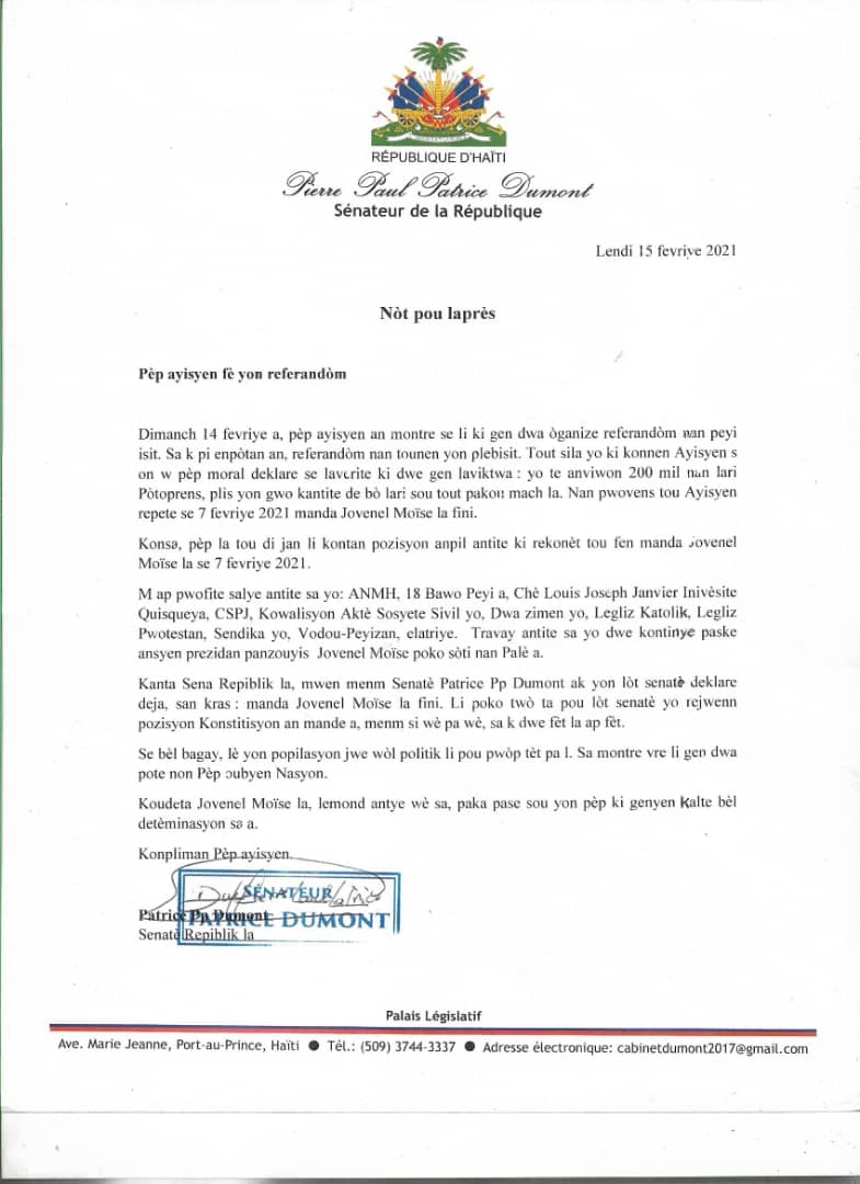 Le peuple haitien, contrairement au referendum bidon et orienté programmé par un gouvernement contesté et rejeté par la majorité de citoyens, quoique formellement interdit par la Constitution, a pourtant, selon le sénateur Patrice Dumont, démontré que « se li ki gen dwa òganize referandòm nan peyi-a« .