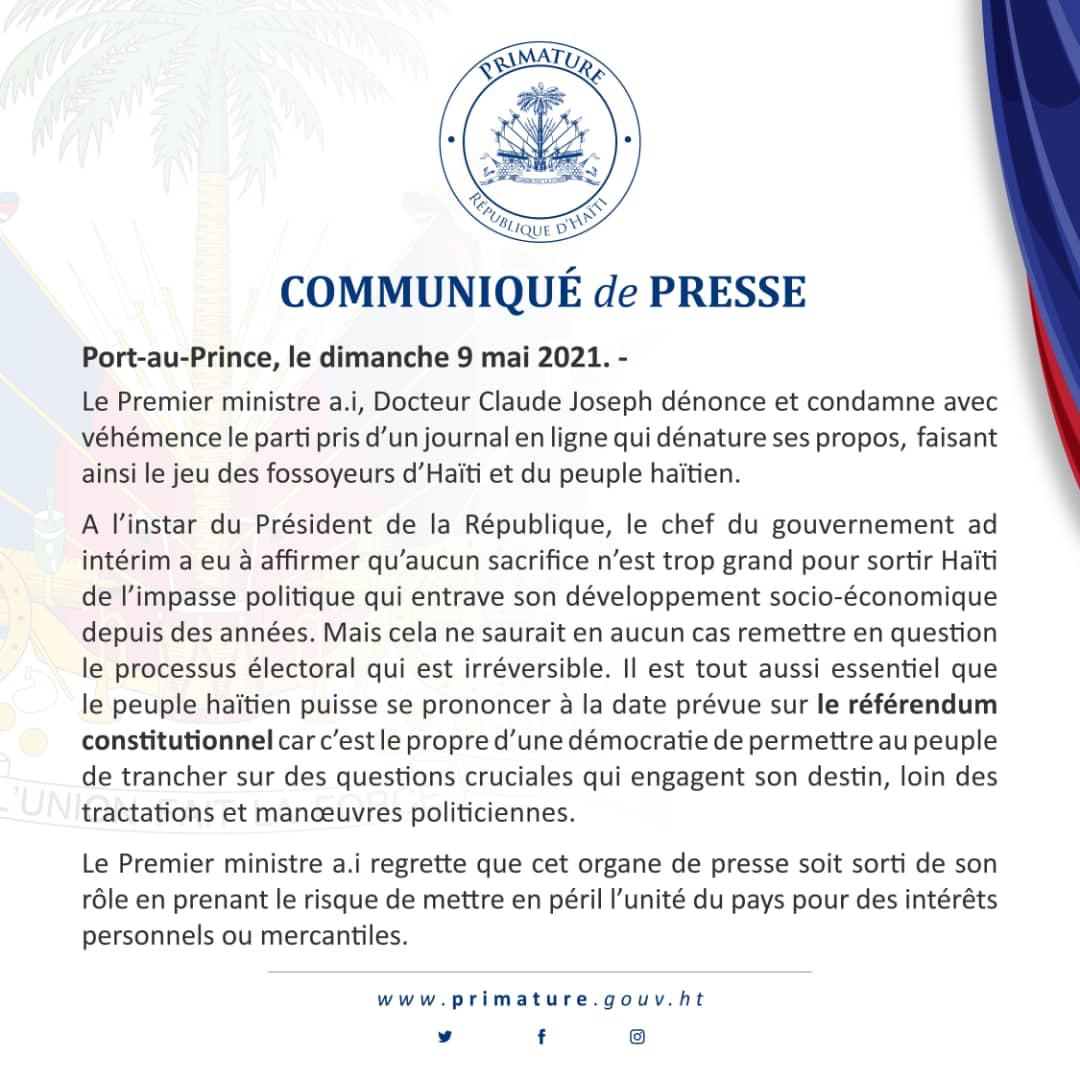 Claude Joseph qui a accusé dans le passé Michel Martelly de vouloir le beurre et l’argent du beurre avec ses deux tragédies électorales, dont l’une a accouché du régime de Jovenel Moise, a, pour sa part, forcé sur l’accélérateur d’une 3e tragédie électorale inévitable, en accusant le journal en question, sans le nommer, de « parti pris » tout en « dénaturant ses propos« .