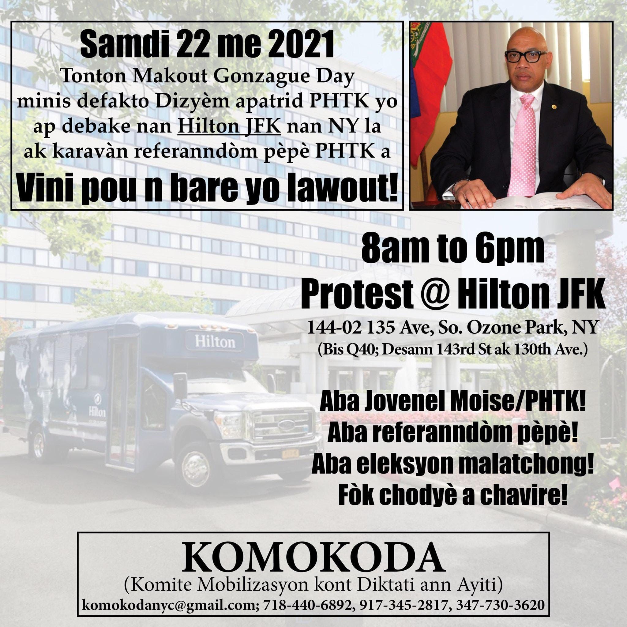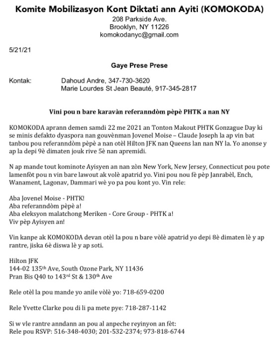 Le comité de mobilisation contre la dictature en Haïti (KOMOKODA) fait appel aux haitiens habitant le Tri-State area (New York, New Jersey, Connecticut) « à venir prêter main forte pour barrer la route à ce corrompu et fils d’apatride, Gonzague Day » qui croit venir faire la leçon à des patriotes et des têtes pensantes jugeant illégal le referendum de Jovenel Moise, en vertu de l’article 284 de la Constitution.