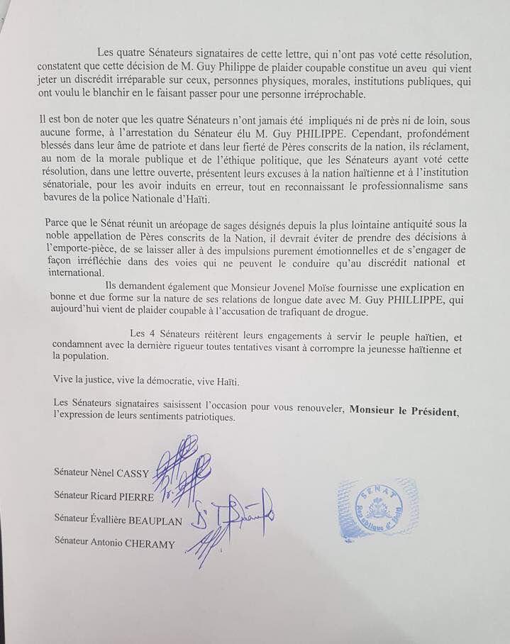 Antonio Cheramy, Evalière Beauplan, Nénèl Cassy et Ricard Pierre ont fait remarquer dans leur note au président du Sénat qu’ ils sont profondément blessés dans leur âme de patriote et de leur fierté de Pères conscrits, au regard du déroulement de ces derniers événements avec un Sénateur-élu reconnu coupable de crime de blanchiment d’argent devant un tribunal étranger.