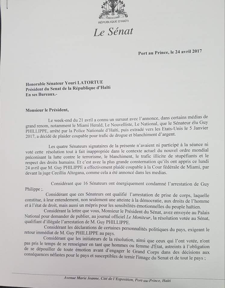 Port-au-Prince, jeudi 27 avril 2017 ((rezonodwes.com)).-Les Sénateurs Cheramy, Beauplan, Cassy et Pierre, les quatre signataires d’une pétition adressée à Youry Latortue, vont s’attirer les foudres des zélés partisans du président Jovenel Moise à qui ces 4 Sénateurs réfractaires demandent des comptes sur ses relations de proximité avec Guy Philippe, coupable de blanchiment d’argent en provenance du trafic des stupéfiants, selon un rapport publié lundi dernier, par le ministère américain de la Justice (DOJ) et reproduit par l’Ambassade des Etats-Unis à Port-au-Prince.