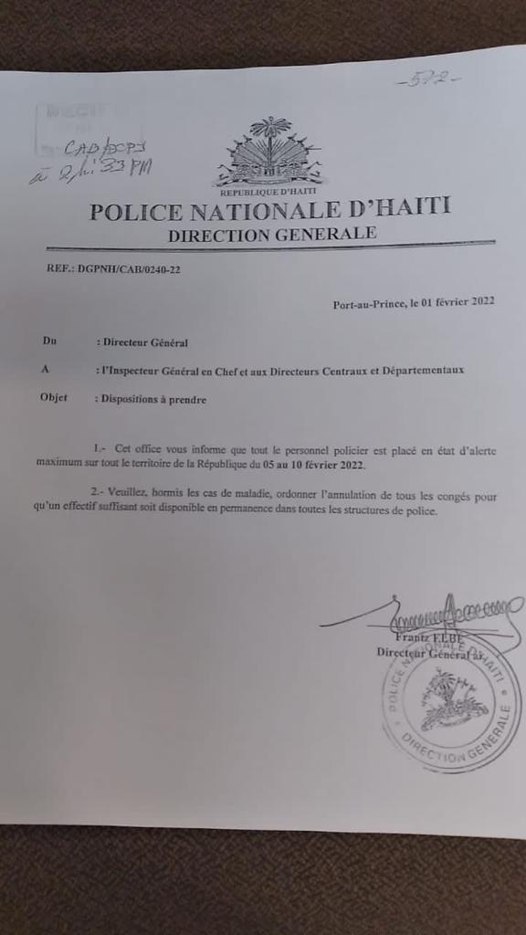 Cette annonce qui prend la forme de chronique d’un massacre annoncé pour permettre à Ariel Henry de garder le pouvoir, au-delà du 7 février 2022, en dehors de tout prescrit constitutionnel, fait injonction aux chefs départementaux « de placer tout le personnel policier en état d’alerte sur tout le territoire de la République du 5 au 10 février 2022« .