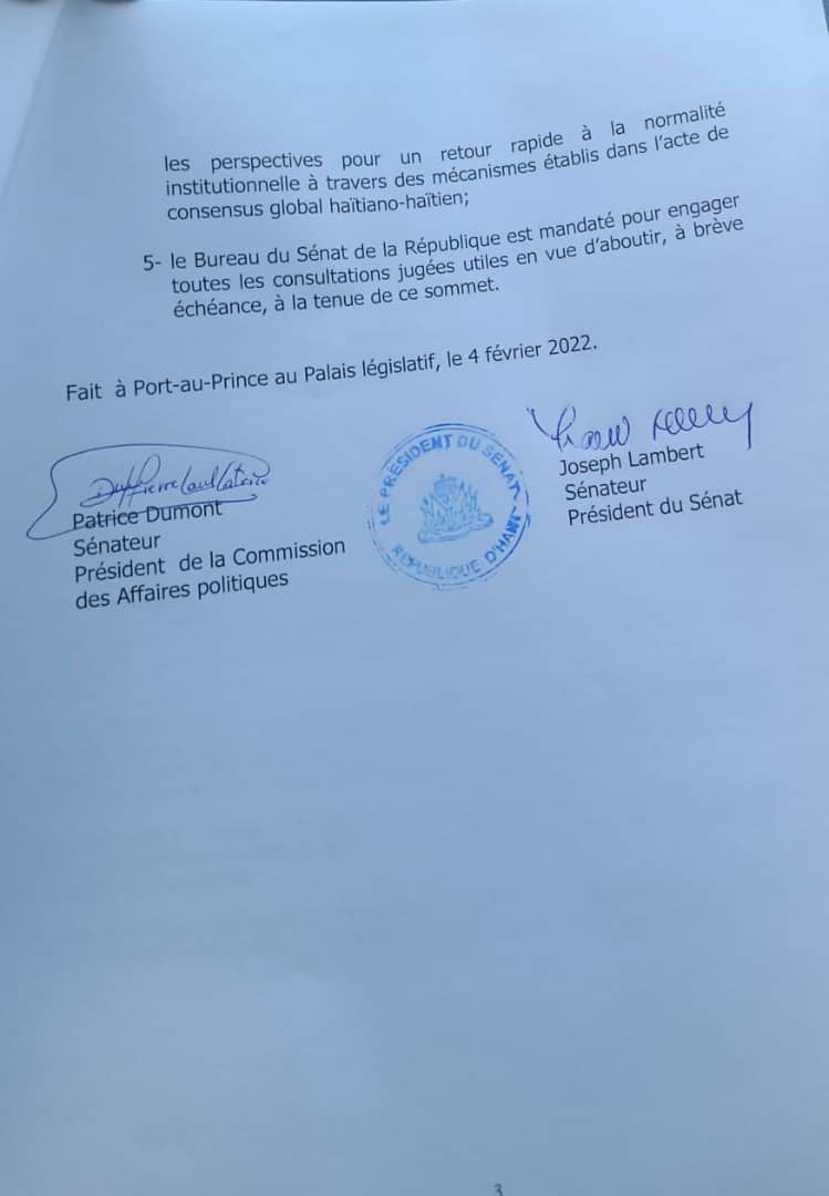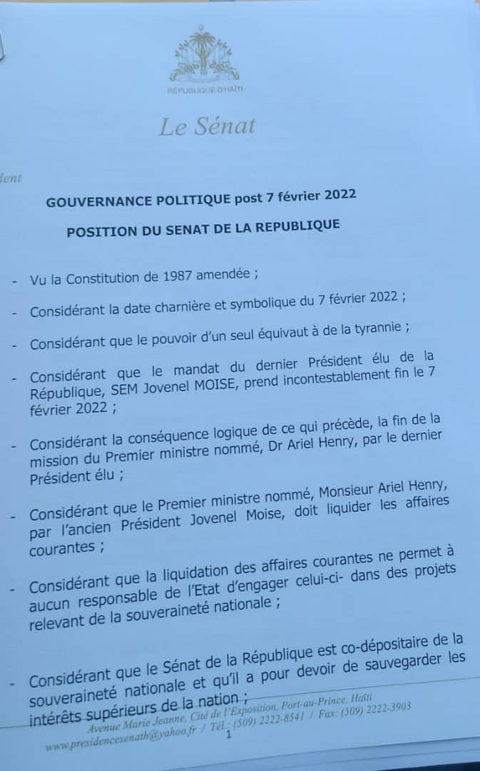 Le Sénat dans son texte de « Gouvernance politique post-7 février 2022« , s’il en est besoin pour plaire aux sempiternels violateurs des droits humains et de la Constitution du 29 mars 1987, rappelle enfin que « le mandat du dernier président élu de la République, M. Jovenel Moise, prend incontestablement fin le 7 février 2022″.