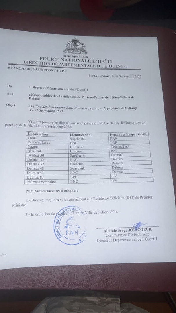 Un memorandum interne signé du principal responsable à la Direction Départementale de l’Ouest (DDO) annonce les couleurs. Il demande à ses troupes, suivant les ordres reçus de la Primature, de « prendre toutes les dispositions nécessaires afin de boucler les différents axes du parcours de la manif du 7 septembre 2022« .