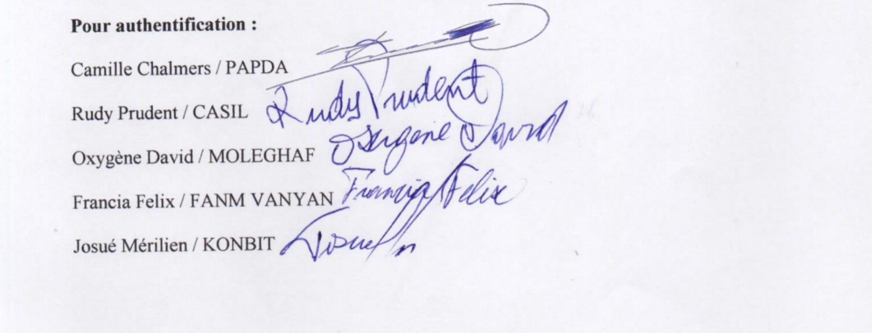 Nous, organisations signataires, vous invitons à vous ressaisir et à faire preuve de respect à l’égard de la lutte du peuple haïtien et réparer les torts énormes commis à son encontre par vos actes et vos propos désobligeants. Nous sommes en outre convaincues, comme déjà signalé lors d’une correspondance en juillet dernier, que le temps est venu pour que les relations entre Haïti et le système des Nations Unies soient désormais définies sur de nouvelles bases compte tenu du bilan négatif et désastreux des missions onusiennes déployées en Haïti depuis la décennie 1990.