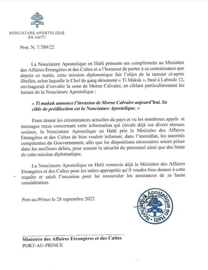 Samedi 1er octobre 2022 ((rezonodwes.com))–La Nonciature Apostolique en Haiti a-t-elle frappé à la bonne porte du paradis pour solliciter aide et protection quand le ministre Jean Victor Généus a lui-même « déserté son appartement situé dans les hauteurs pour cause d’inécurité », avons-nous appris? Ou le représentant du Saint-Père en Haïti, dans le secret des dieux, a-t-il simplement choisi de s’adresser au ministre de facto, Jean Victor Généus, parce que celui-ci a « tout sur contrôle » avec probablement le remote contrôle d’activation à volonté des gangs criminels G9 an fanmi ak alye?
