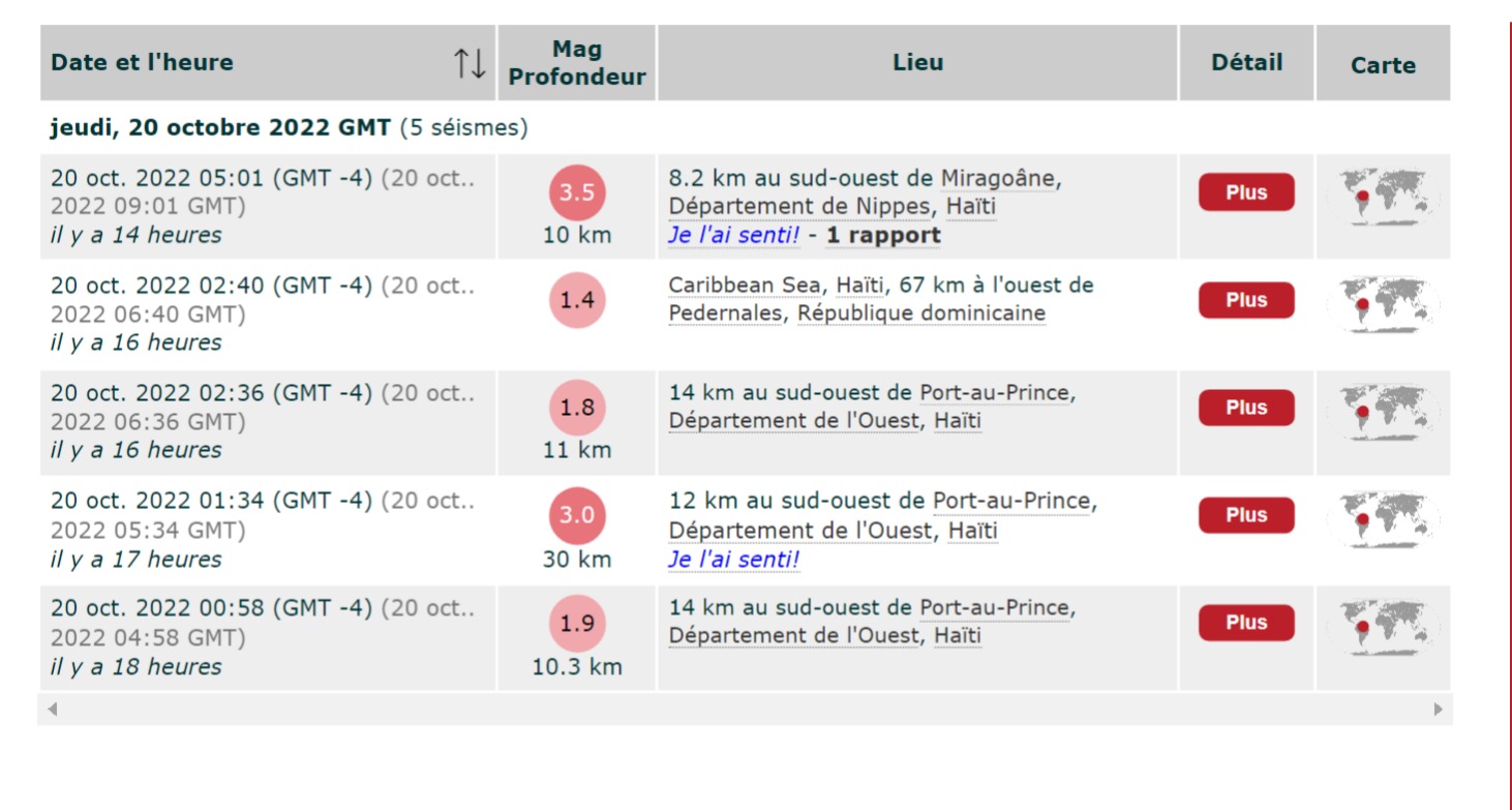 Jeudi 20 octobre 2022 ((rezonodwes.com))–Selon les données scientifiques de volcano discovery consultées par Rezo Nòdwès, de tous les cinq séismes qui ont secoué plus ou moins le pays jeudi, le plus fort d’entre eux de magnitude 3.5 avait son épicentre localisé à 8.2 km au sud-ouest de Miragoane.