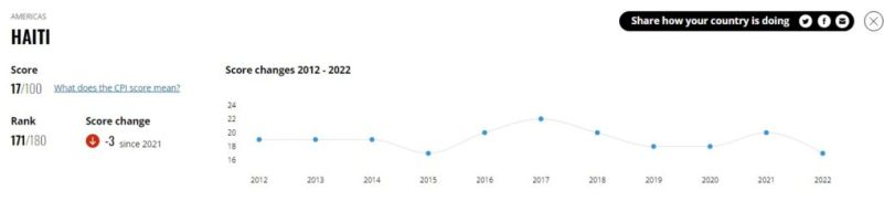 Des élections « libres et sincères », cela ne saurait exister en aucun cas avec un gouvernement qui a obtenu un score sans précédent de 17/100 dans l’Indice de perception de corruption. Haiti de la coalition PHK-SDP-Fusion-Inite est le pays le plus corrompu de l’Amérique et des Caraïbes après le Venezuela. On comprend maintenant le pourquoi de la prolifération des gangs criminels en 2022 agissant en toute impnité.