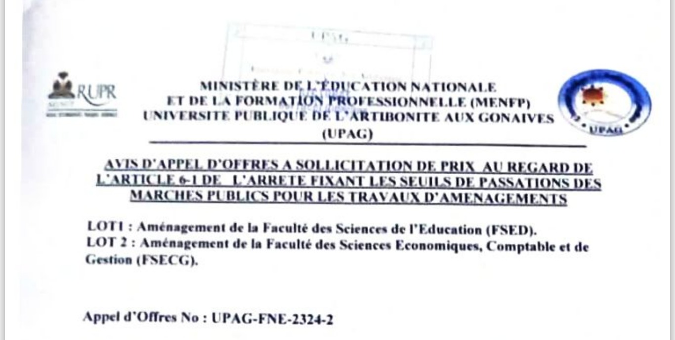 Le Rectorat de l’Université Publique de l’Artibonite Aux Gonaïves (UPAG) lance un appel d’offres pour l’exécution des travaux d’aménagement dans les bâtiments abritant les Facultés des Sciences Économiques, Comptables et de Gestion (FSECG) ainsi que la Faculté des Sciences de l’Éducation (FSED). Ces travaux seront financés par une subvention des Fonds Nationaux d’Éducation (FNE).