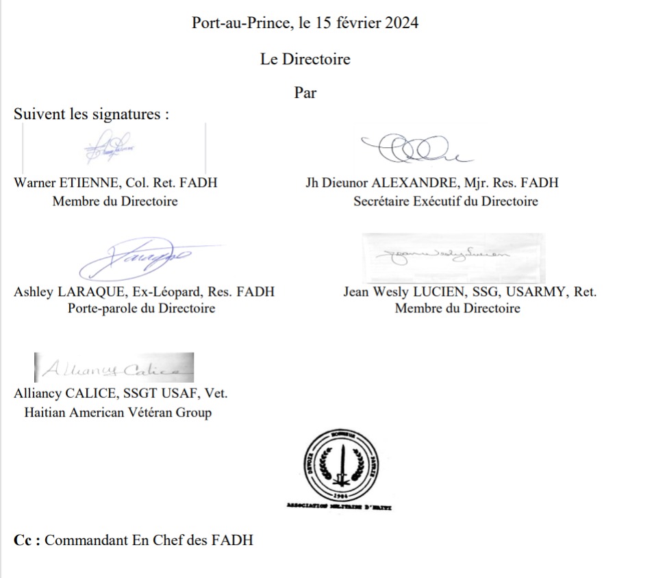 Pourquoi, le Directoire de l’Association Militaire d’Haïti et le groupe des Vétérans Haitiano-américains, avec le soutien de la société civile, demandent formellement au Commandant en Chef des FADH et à son Etat-major de prendre fait et cause pour la Patrie en demeurant disponibles pour servir de garantie au cadre de discussion contenu dans le document annexé au présent Mémorandum