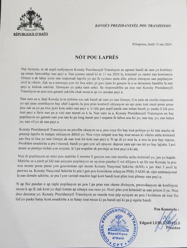 Le peuple haïtien, c’est avec une grande inquiétude que le Conseil Présidentiel de Transition a appris que les bandits continuent de semer le trouble dans notre pays. Le samedi 11 mai 2024, des criminels sont entrés dans le commissariat de Gressier et chez l’un des responsables de la police, provoquant des incendies et victimisant plusieurs civils. Cet incident témoigne une fois de plus de l’urgence de déraciner le banditisme dans notre pays, donc la sécurité. Les citoyens ne peuvent plus attendre. La responsabilité du Conseil Présidentiel de Transition est de garantir la sécurité de chaque personne vivant dans le pays.