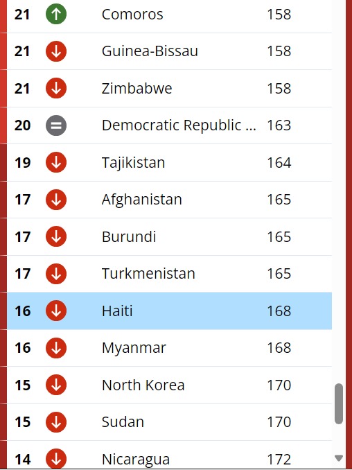 L’Indice de Perception de la Corruption (CPI) classe 180 pays selon leur niveau perçu de corruption dans le secteur public, sur une échelle de 0 (hautement corrompu) à 100 (très propre). Haïti figure en dernière position dans les Caraïbes et se classe 168ᵉ au monde. Pour que le pays puisse progresser, Transparency International recommande des mesures urgentes, notamment un renforcement des institutions démocratiques, une plus grande transparence des finances publiques et une lutte active contre l’impunité des élites corrompues.