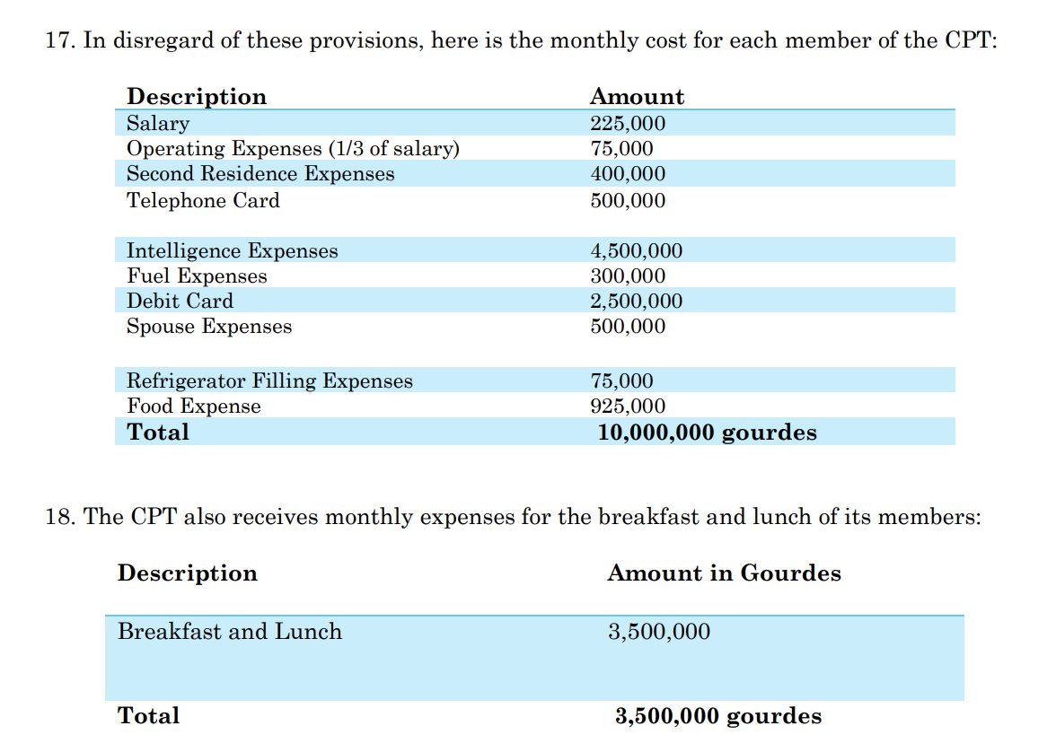 Le rapport du RNDDH dévoile une architecture budgétaire choquante : chaque membre du CPT – incluant les 3 braqueurs de la BNC – perçoit un salaire de 225 000 gourdes, auquel s’ajoutent des frais de fonctionnement (75 000 gourdes), des dépenses pour une résidence secondaire (400 000 gourdes), des cartes téléphoniques et de débit cumulant plusieurs millions, ainsi que des allocations pour conjoint et pour remplissage de réfrigérateurs. Le total atteint ainsi 10 millions de gourdes mensuellement, par conseiller. De surcroît, 3,5 millions de gourdes supplémentaires sont affectés aux seuls frais de repas (petit-déjeuner et déjeuner).