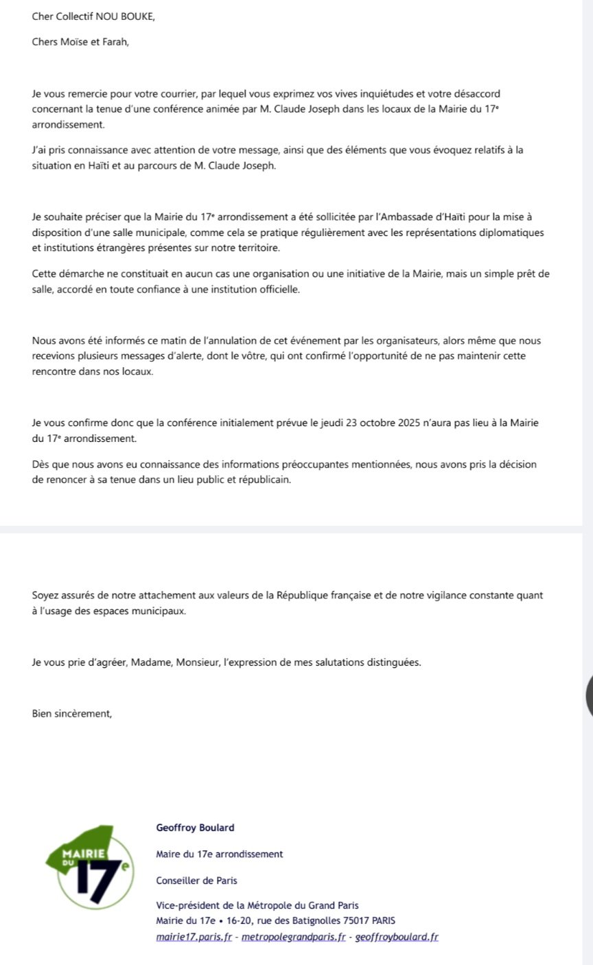 Dans une lettre adressée au collectif et rendue publique, Geoffroy Boulard, maire du 17ᵉ arrondissement et vice-président de la Métropole du Grand Paris, a précisé que la mise à disposition de la salle municipale avait été sollicitée par l’Ambassade d’Haïti en France, selon une pratique courante pour les représentations diplomatiques. Il a toutefois souligné que “cette démarche ne constituait en aucun cas une organisation ou une initiative de la Mairie”, mais un simple prêt de salle “accordé en toute confiance à une institution officielle”.