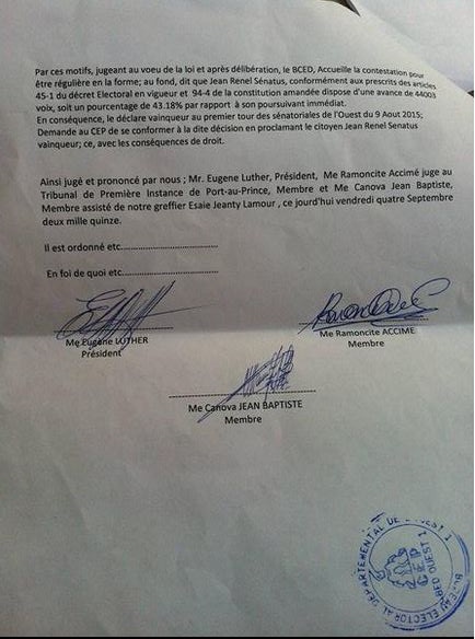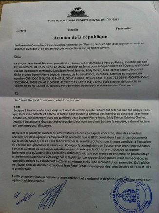 Me Jean Renel Sénatus, candidat au sénat sous la bannière de LIDE est élu au premier tour. C`est ce que vient d`annoncer cet après-midi l`équipe de campagne de l`ex-commissaire du gouvernement qui s`est présenté pour gagner un des deux sièges disponibles dans le département de l`Ouest.