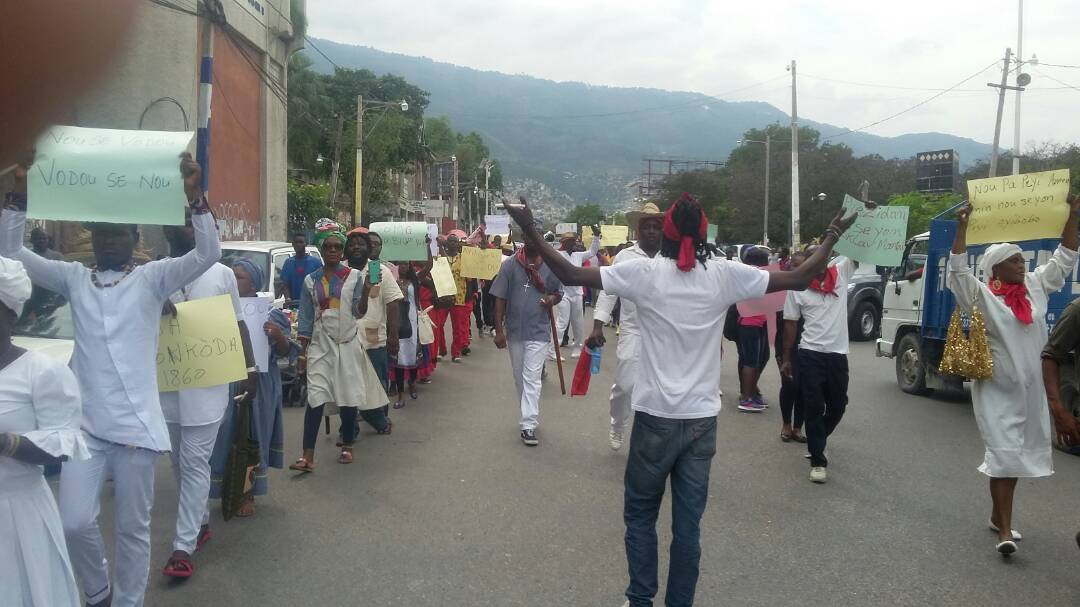 Les protestataires, au cours de cette marche, ont reproché au président Jovenel Moise de piétiner la culture des ancêtres, lorsque durant la croisade évangélique « IN HAITI » organisée au stade Sylvio Cator, le chef de l`état a demandé au peuple haïtien de suivre le même chemin que les protestants.