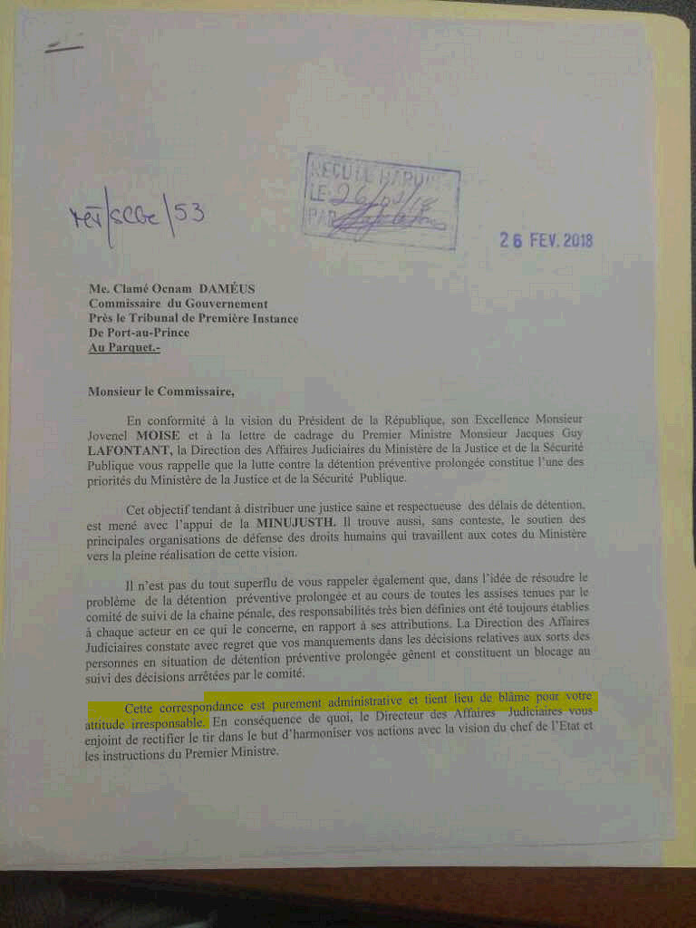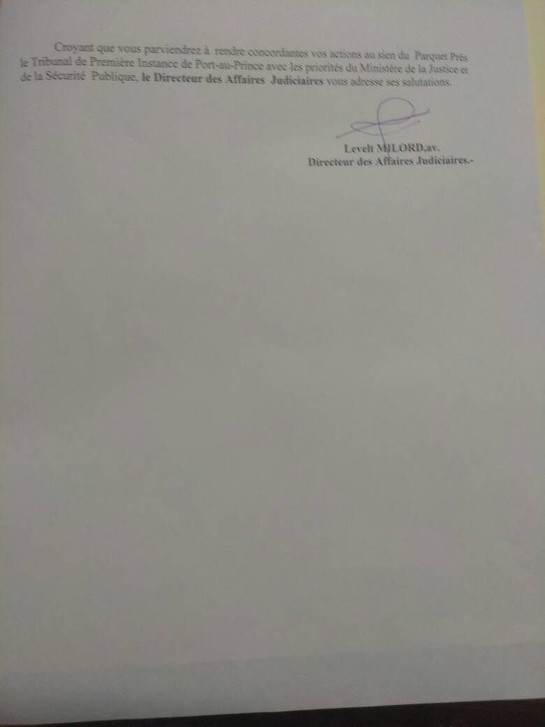 M. Milord lui reproche des « mauvaises habitudes consistant à garder l’exclusivité des décisions tendant à la relaxe de tout prévenu et/ou accusé« . De telles pratiques, poursuit-il, « sont contraires aux vœux de la déclaration universelle des droits de l’homme et à la convention inter-américaine des droits humains« .