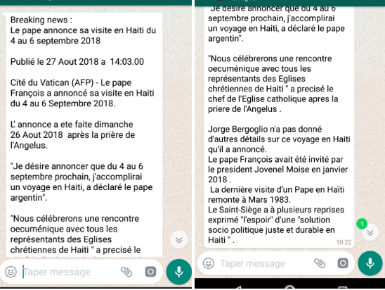 Le pape François aurait annoncé sa venue en Haïti du 4 au 6 septembre prochain, selon une dépêche attribuée à l’AFP et virale sur WhatsApp et Facebook. C’est faux: l’AFP n’a rien écrit de tel et le pape doit recevoir des pèlerins à Rome pour une audience papale le 5 septembre
