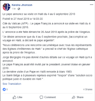 Mercredi 30 août 2018 (((rezonodwes.com)) – L’AFP (Agence France Presse) a démenti la fausse dépêche annonçant une visite du pape François en Haiti du 4 au 6 septembre 2018 et qui lui a été attribuée.
